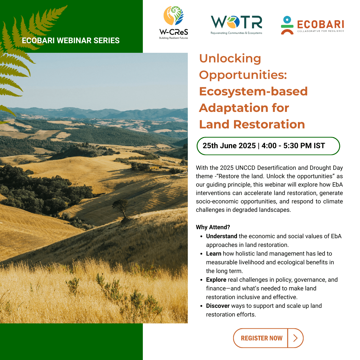 This webinar explores how Ecosystem based Adaptation interventions have the potential to accelerate land restoration, generate socio-economic opportunities and respond to climate challenges in degraded landscapes.