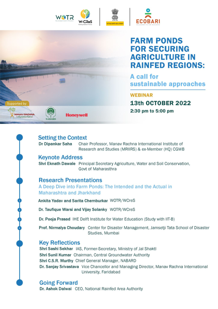 “Farm Ponds for Securing Agriculture in Rainfed Regions: a call for sustainable approaches” was co-hosted by WOTR, W-CReS, NRAA, and ECOBARI on 13th of October 2022. The webinar aimed to foster dialogue on the use of farm ponds in rural communities, focusing on equity, income security, and ecosystem health, particularly concerning groundwater. The event featured prominent speakers, including researchers, government officials, and professors, and brought together diverse stakeholders such as development practitioners, NGO representatives, and researchers. Community-level representatives also shared their experiences in water governance practices.